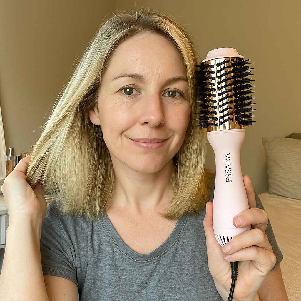 Your dryer fries the ends while roots stay damp. Essara™ dries everything evenly so nothing gets damaged. One pass with the oval brush and twenty minutes later your hair looks like you left the salon.